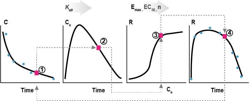 시간에 따른 PK-PD 관계가 즉시효과를 보이는 경우, 시간에 따른 농도와 효과간 관계를 도식화하면 최대 농도에서 최대 효과를 보이는 등 변화 양상이 유사하다. 이를 동일한 시점에서의 농도와 효과간 관계로 도식화하면 동일한 농도에서는 동일한 효과를 보이게 된다. 이에 반해, 지연효과를 보이는 약물의 경우 최대 농도와 최대 효과를 보이는 시점간 시간적인 지연이 발생한다. 또한 동일한 농도에서의 효과가 한가지로 정해져 있지 않고 농도가 증가하는 시점과 감소하는 시점에서 각각 다르게 나타나는 현상을 보인다. (그림 20.1)